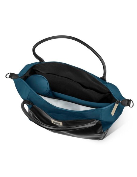 La borsa Shopper CYBEX Platinum è dotata di un porta bevande termico rimovibile, un tappetino per il cambio e uno scomparto per indumenti bagnati.