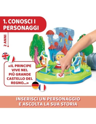 CONOSCI I PERSONAGGI: Il bambino inserisce un personaggio alla volta per ascoltare la sua storia; può scegliere tra 4 personaggi principali e 6 comparse