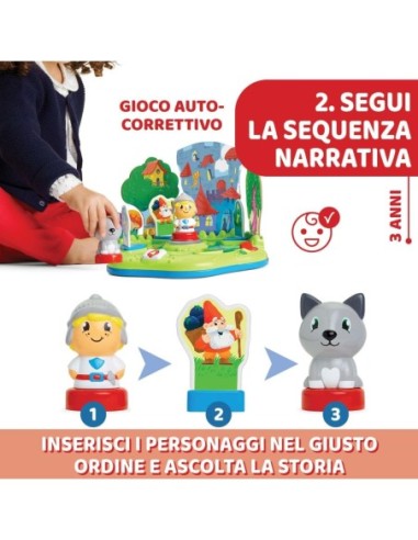 TROVA IL PERSONAGGIO: Il bambino impara le sequenze inserendo i personaggi indicati nel giusto ordine per ascoltare la storia; grazie alla funzione di autocorrezione, il gioco riconosce se il personaggio inserito è corretto, fornendo un feedback immediato