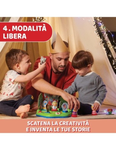 4 MODALITÀ EVOLUTIVE: Nelle prime tre modalità di gioco, con l'utilizzo della base elettronica, i bambini possono ascoltare ben 34 divertenti storie con suoni e magici effetti; la quarta, invece, li lascia completamente liberi di creare le proprie storie