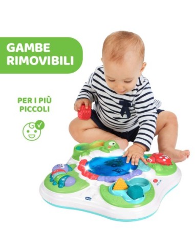 GAMBE RIMOVIBILI: quando il bambino è ancora troppo piccolo per stare in piedi da solo, le gambe del Tavolo Sensoriale Chicco possono essere rimosse per farlo giocare in totale sicurezza sul pavimento