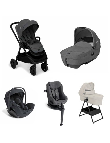 Trio di Joie che comprende il passeggino Finiti, la navicella Calmi R129, il seggiolino auto con base i-Harbour e il seggiolino auto i-Level Pro