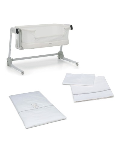 Il completo lenzuolino per co-sleeping evolutivo iCrib è caratterizzato da ricami classici nelle tinte del grigio.