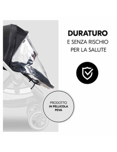 Un'ulteriore chiusura a strappo fissa il parapioggia ai lati e il bimbo rimane sempre asciutto. La copertura, robusta e durevole, è realizzata in pellicola PEVA, innocua per la salute.