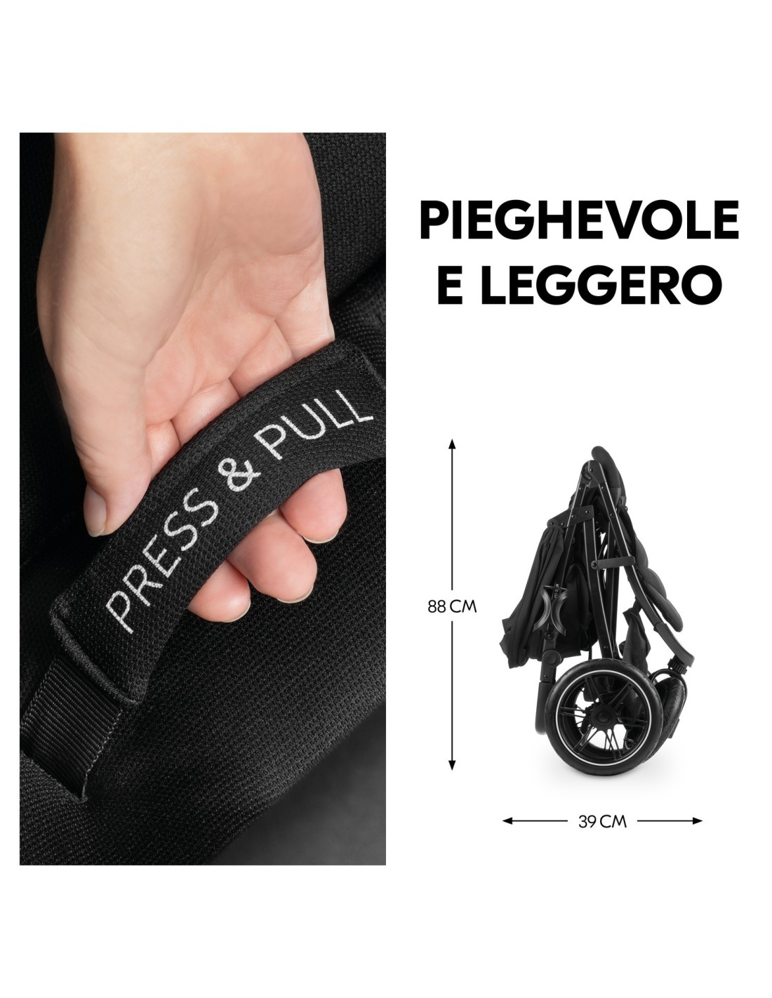 • Caratteristiche: grandi ruote pneumatiche, maniglione regolabile (75-110 cm), funzione reclinabile, poggiapiedi regolabile, capottina estensibile e rimovibile con protezione UV 50+, barra di sicurezza rimovibile, imbracatura a 5 punti, sospensioni, ampio cestino portaoggetti, portabicchieri, meccanismo di ripiegamento con una sola mano