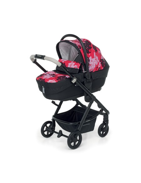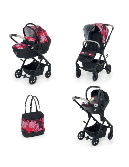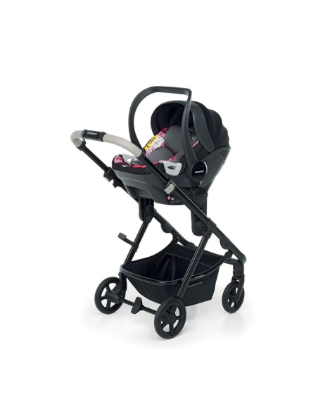 Sistema trio combinato composto da: passeggino EUREKA, adatto dalla nascita fino a 22 kg, con seduta reversibile e capottina regolabile in altezza, navicella CLASSIC rigida, seggiolino auto Next i-Size per bambini da 40 a 80 cm, borsa mamma a doppio fondo rigido con tasca termica e materassino per il cambio.