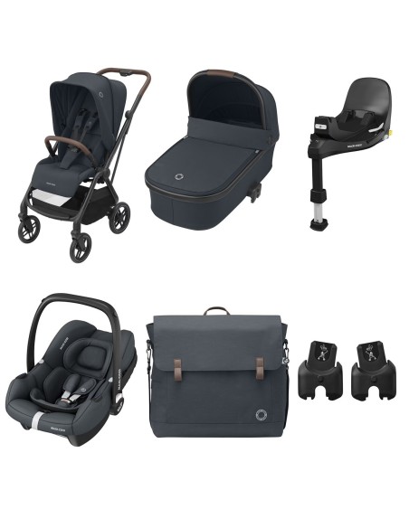 Il trio Maxi Cosi comprende : Il Passeggino Leona2, La navicella Oria, L'ovetto Cabriofix, gli adattatori per ovetto, la Modern Bag e la base Cabriofix i-Size