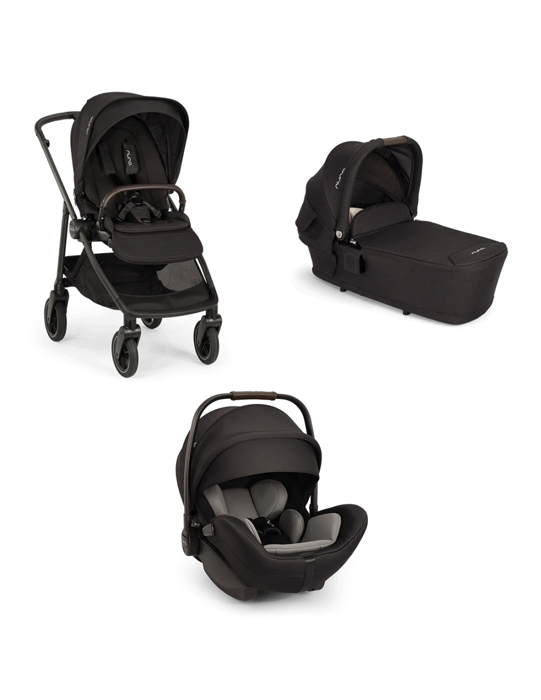 Trio di Nuna che comprende il passeggino Swiv, la navicella Lytl e l'ovetto Arra Flex.