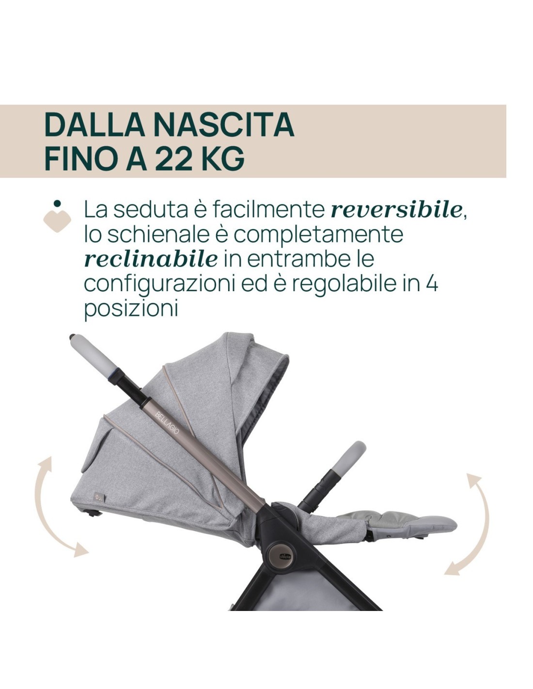 La seduta reversibile consente di utilizzare il passeggino in due diverse direzioni. Fronte genitore per i primi mesi dove il bambino ha bisogno di rassicurazioni grazie allo sguardo e al contatto di mamma e papà, fronte mondo per quando sarà più grande. Il momento giusto per cambiare direzione? Sarà il bambino stesso a farlo capire: se si girerà continuamente per guardarsi intorno, allora vorrà dire che è pronto a scoprire il mondo.