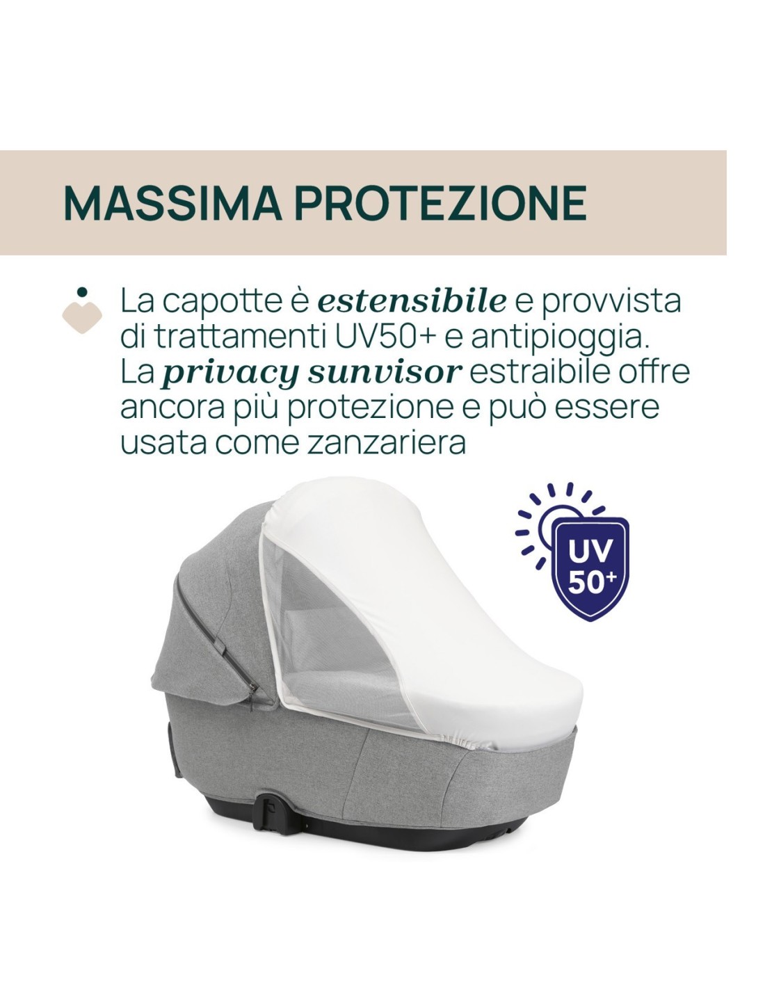 La scocca della culla è ora più leggera, mantenendo comunque tutta la resistenza e la protezione necessarie per il tuo neonato. Il rivestimento interno, dotato di una rete rigida in corrispondenza dell’apertura sulla testa, offre un’ulteriore sicurezza, garantendo un sostegno protettivo per la testa del tuo bambino.
