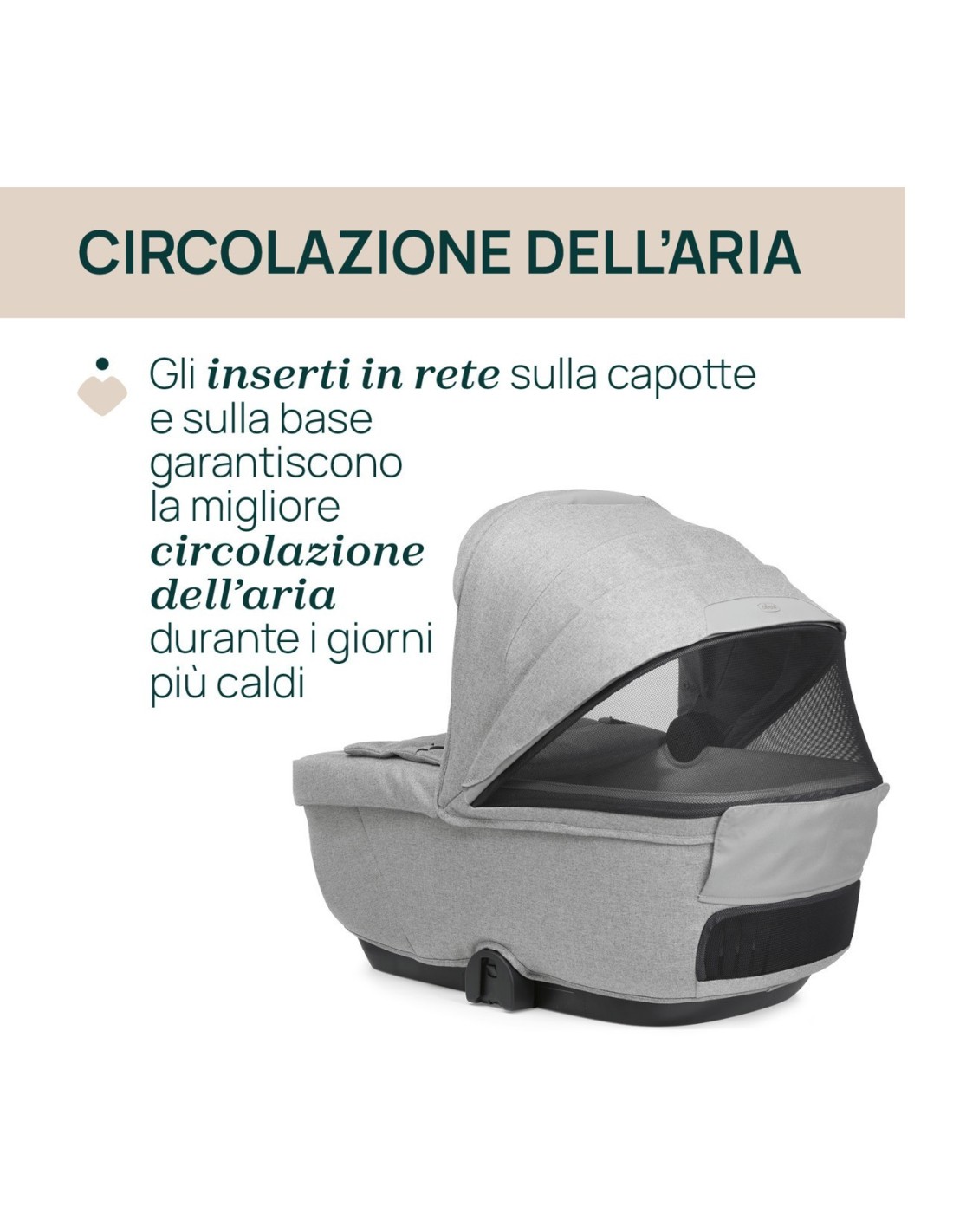 Nella stagione calda, la copertura può essere facilmente rimossa, esponendo una seduta a doppio strato di rete traspirante che permette una corretta dissipazione del calore e una termoregolazione ottimale per il bambino.