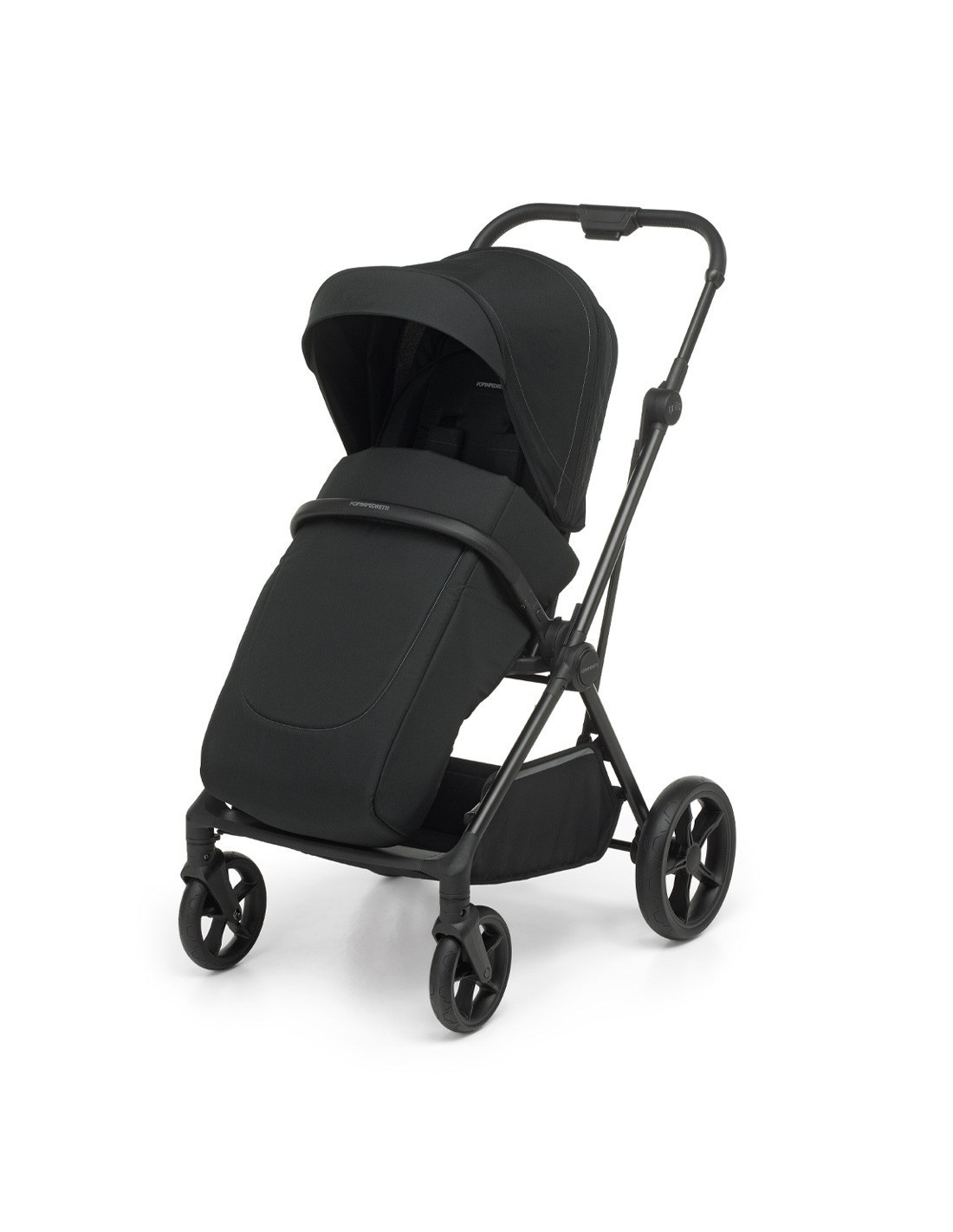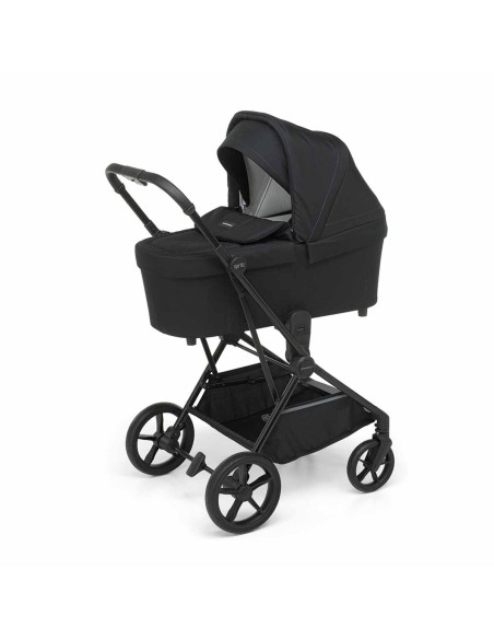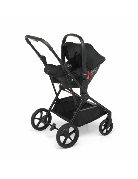 Sul leggero telaio in alluminio si possono montare la navicella pieghevole salvaspazio per neonato, la seduta passeggino chiudibile fronte mamma e fronte strada, il seggiolino auto i-Size per bambini da 40 a 85 cm di altezza (peso massimo 13 kg).