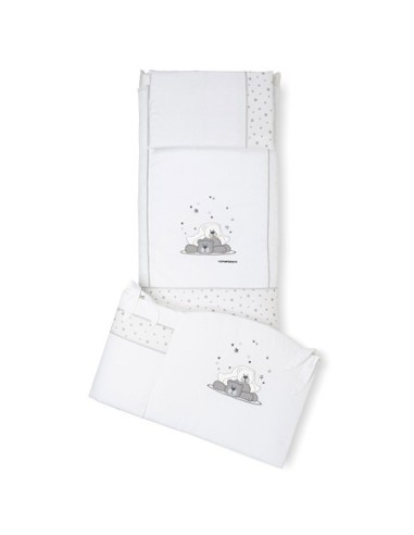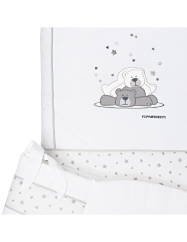 Il completo piumone Pikkoletto Dolcestella di Foppapedretti è caratterizzato da ricami con due teneri orsetti e tante stelline, nelle tinte del grigio oppure del beige. Il set tessile è composto da paracolpi con imbottitura in poliestere 100% e rivestimento in cotone 100%, sacco sfoderabile in cotone 100% e imbottitura in poliestere 100% e federa per cuscino in cotone 100%.