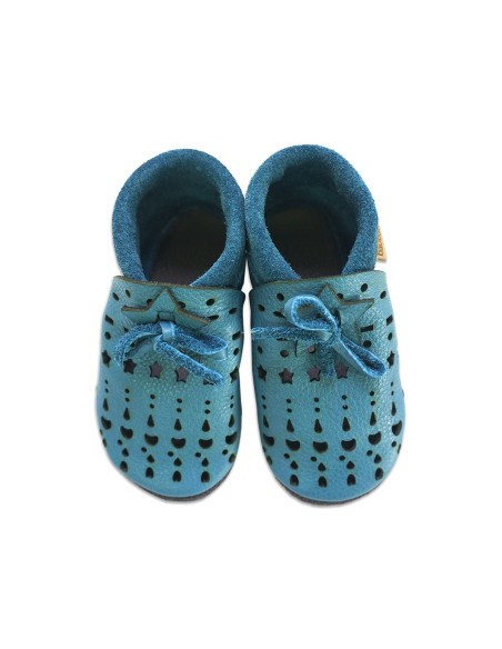 Tutte le scarpine sono realizzate e cucite a mano, senza uso di colle. Il bordo alla caviglia non prevede elastico che stringe, bensì un morbido risvolto vellutato. La suola morbida e antiscivolo consente di lasciare che il bambino percepisca le varie tipologie di suolo, questo input sensoriale è estremamente importante per un corretto sviluppo del piede.