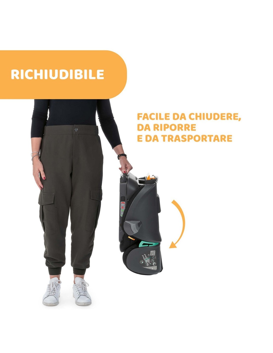 - Il seggiolino auto è completamente richiudibile per poter essere facilmente spostato da un'auto all'altra o riposto all'interno del bagagliaio.