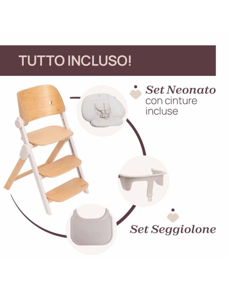 Tutti gli accessori sono inclusi nella scatola: sedia, kit per neonati e kit pappa.