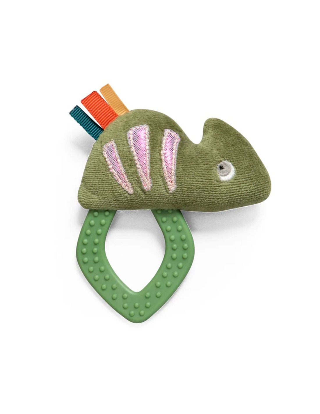 Sotto la pancia, il camaleonte ha un anello da dentizione con morbide borchie, mentre la parte superiore del corpo del camaleonte presenta piccole alette da coccolare dai colori vivaci.