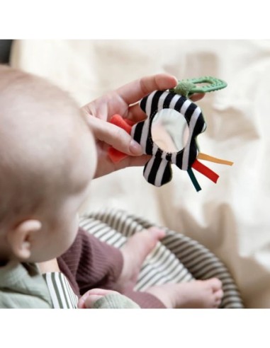 Il sonaglio ha la forma di una foglia: da un lato verde con strisce bianche e nere e dall'altro uno specchietto per bambini.