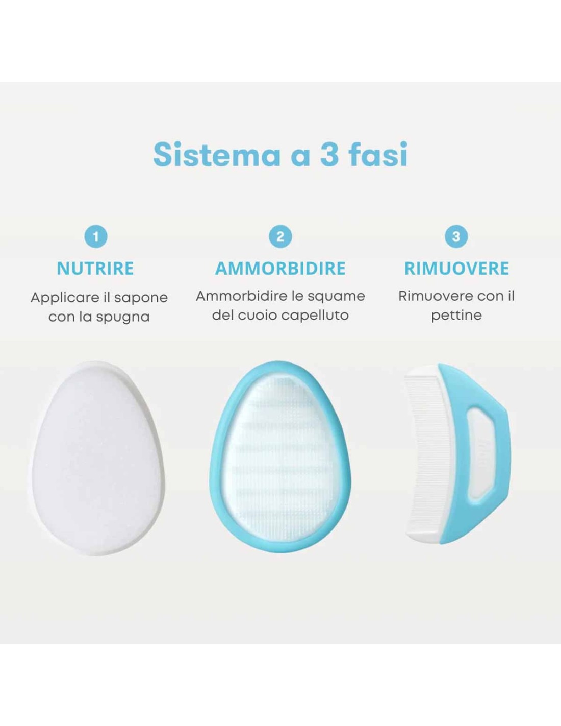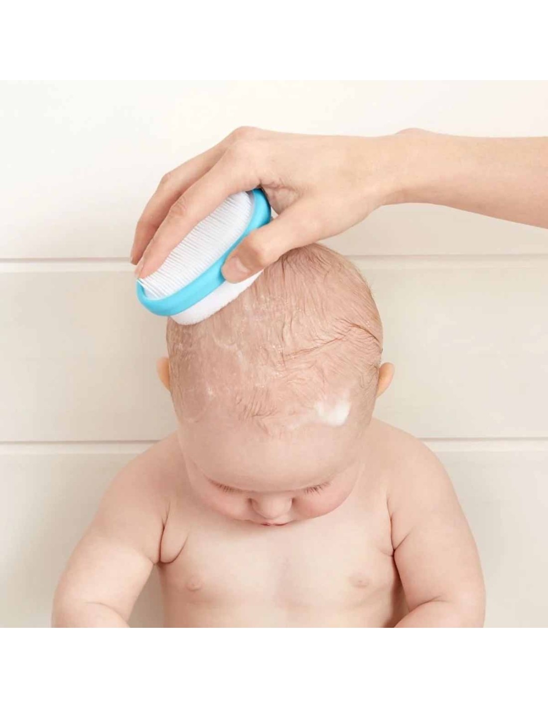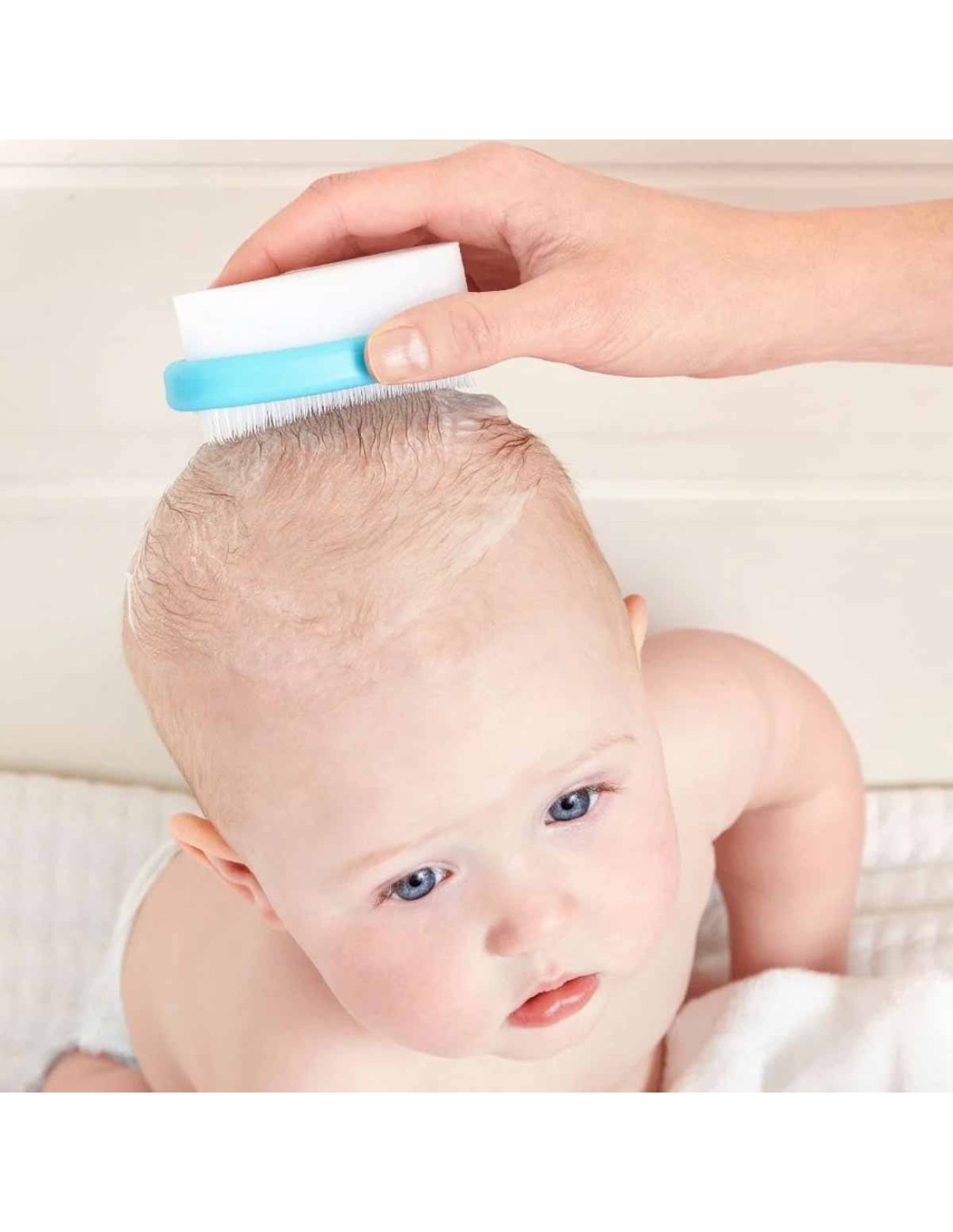 AMMORBIDIRE: Ammorbidite le squame del cuoio capelluto massaggiando con movimenti circolari utilizzando una spazzola delicata che si adatta alla testa del bambino.