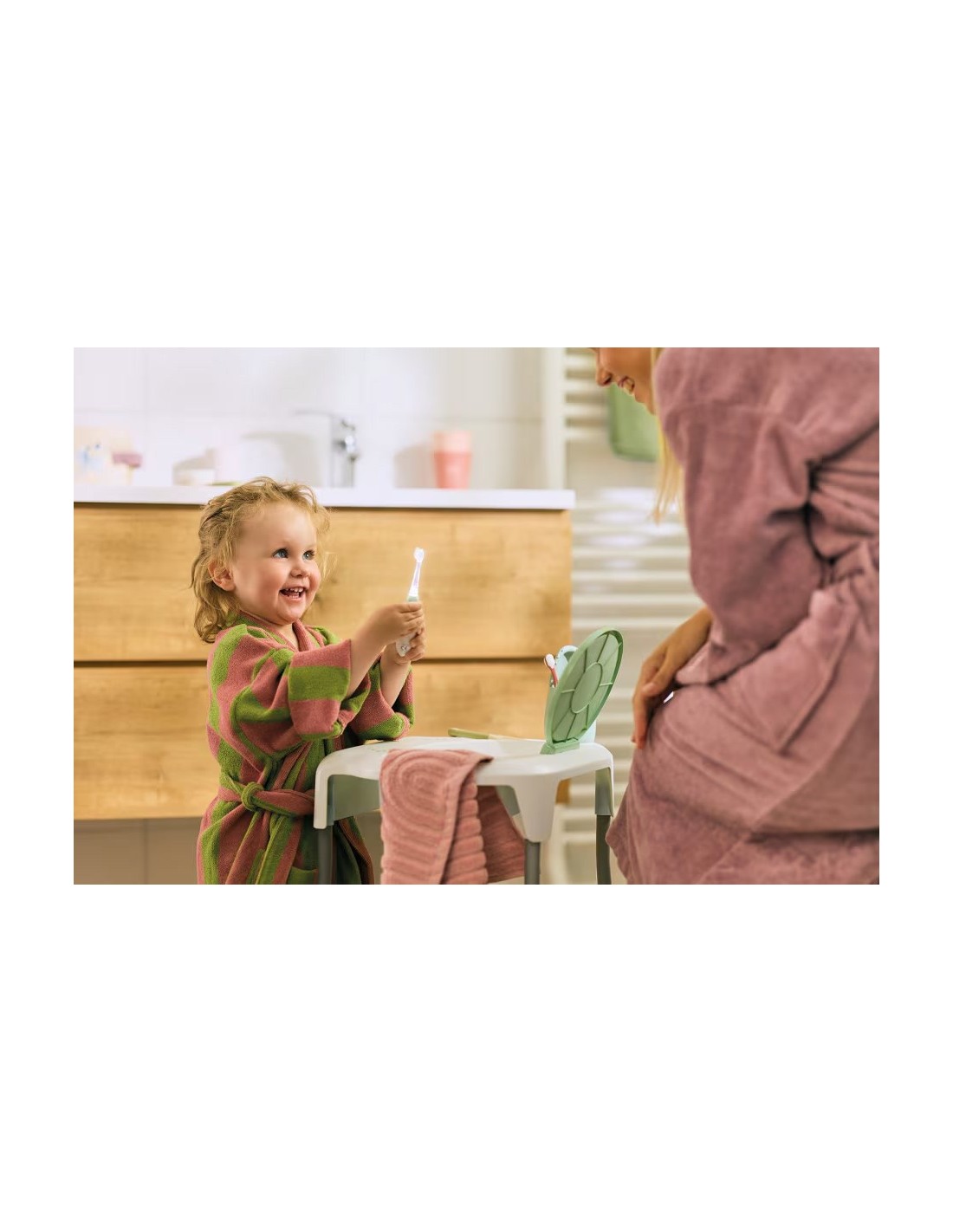 Lo spazzolino da denti elettrico è dotato di un motore silenzioso e di un timer intelligente da 2 minuti con promemoria ogni 30 secondi, che contribuisce allo spazzolamento dei denti del bambino senza incertezze. Dal primo dentino alla prima infanzia, l'importante è rendere naturali le buone abitudini e mantenere quei grandi sorrisi smaglianti.