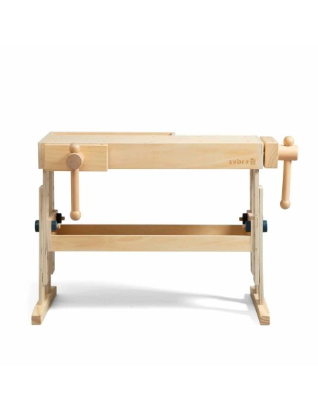 Il banco per la lavorazione del legno è dotato di due morse, una frontale e una laterale, e di un ripiano aperto sul fondo per riporre gli utensili.