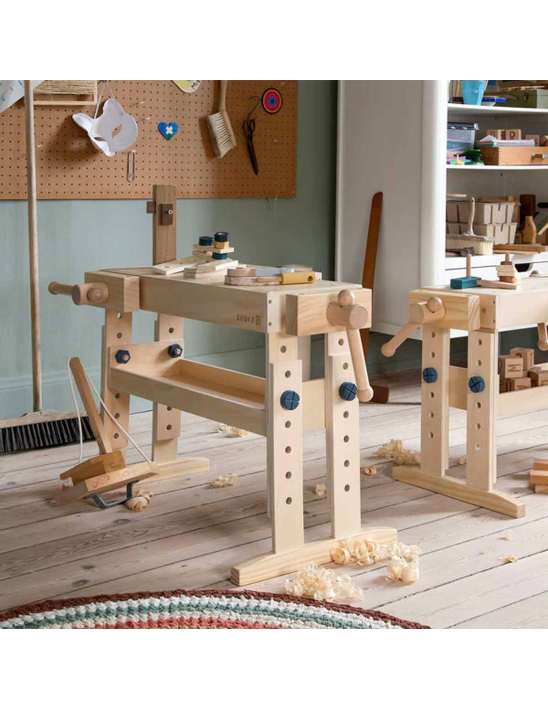 Banco di lavoro per bambini in legno, con gambe regolabili in altezza, per far crescere il banco di lavoro insieme al bambino.