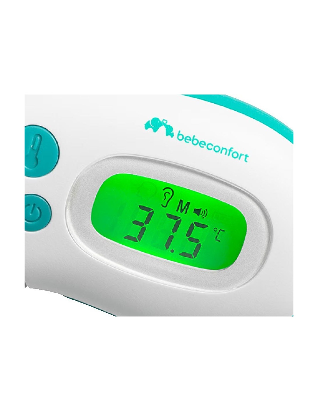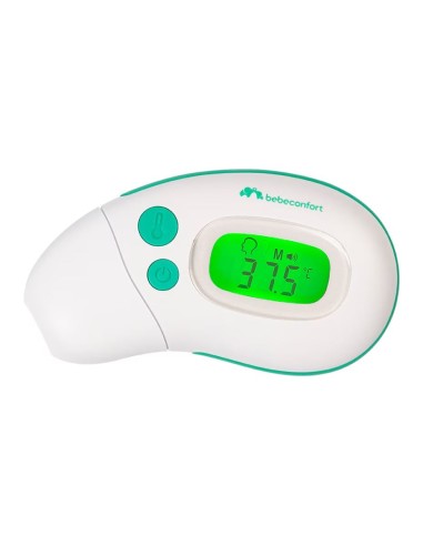 Il mini termometro multifunzione Bebeconfort utilizza la tecnologia a infrarossi per misurare senza contatto la temperatura della fronte, delle orecchie, dell'acqua del bagnetto, degli alimenti e dell'ambiente.