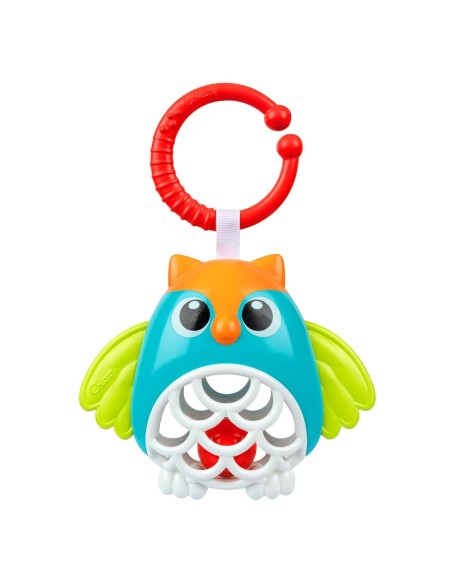 Trillino a forma di gufo con la pancia in plastica morbida contenente una pallina che crea un simpatico movimento quando si scuote il giocattolo