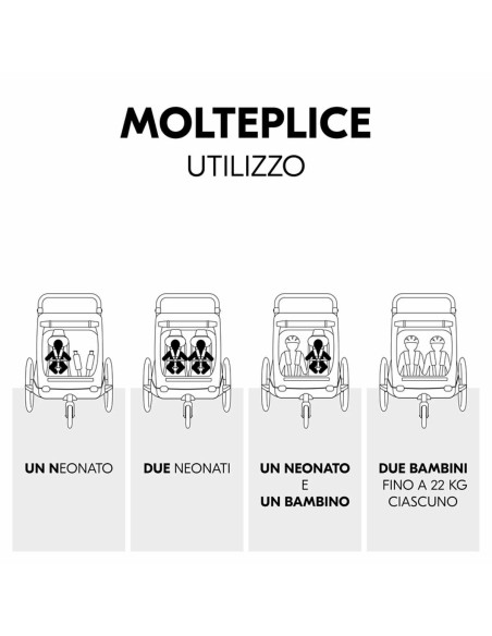 Simile a un’amaca, il morbido seggiolino imbottito permette al bambino di viaggiare ammortizzato e in sicurezza nel rimorchio per bici, fino a 10 mesi o a 75 cm di lunghezza. Inoltre lascia sufficiente spazio a un altro bambino. La modalità passeggino è consigliata fino a 6 mesi.