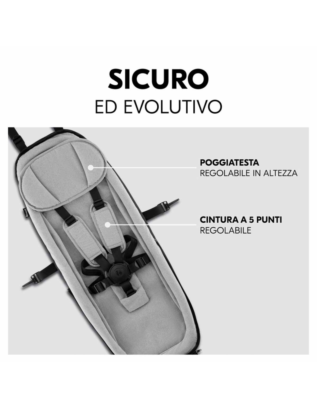 Il coprigambe incluso protegge e riscalda quando fa freddo. Mentre il poggiatesta e la cintura a 5 punti, entrambi regolabili, si adattano perfettamente alla crescita del bambino. La cintura lo protegge al meglio durante i viaggi.