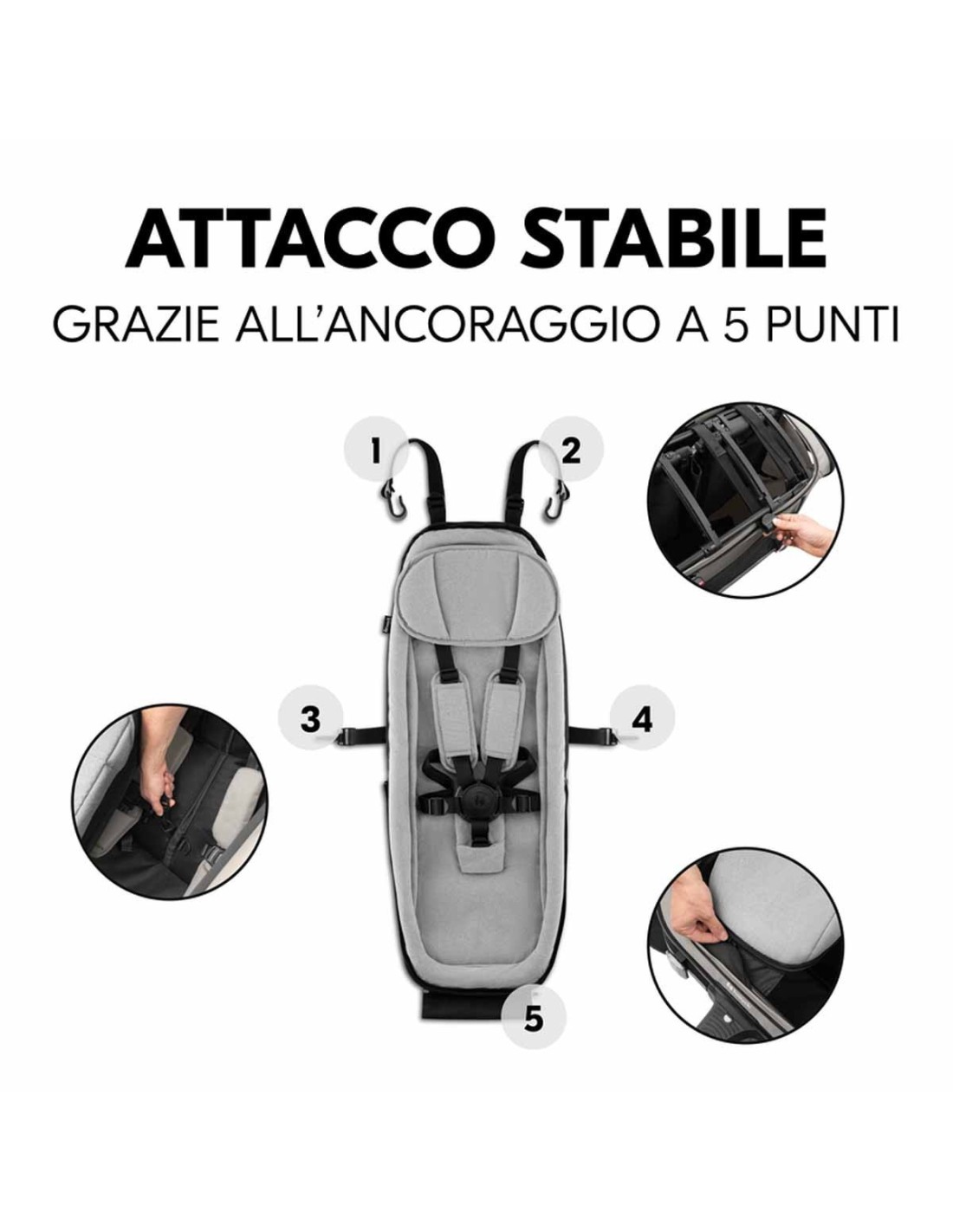 Seggiolino facile da montare grazie all’ancoraggio a 5 punti. Si crea il sistema di un’amaca in tensione facile da agganciare alla barra trasversale sotto, al telaio sopra e ai lati.
