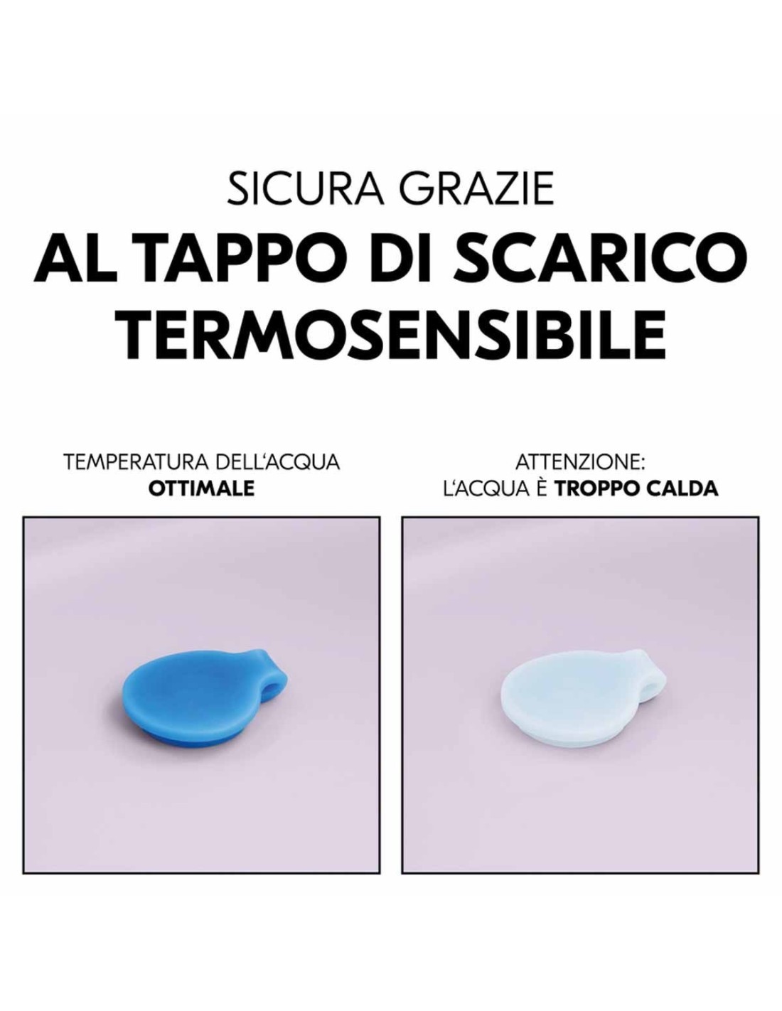 I piedini di appoggio richiudibili, permetteranno alla vaschetta di essere poggiata saldamente su qualsiasi superficie piana. Inoltre, il tappo fornisce informazioni sulla temperatura dell'acqua, poiché diventa bianco quando troppo calda. La temperatura ideale e sicura per il tuo bambino è di 36°C.
