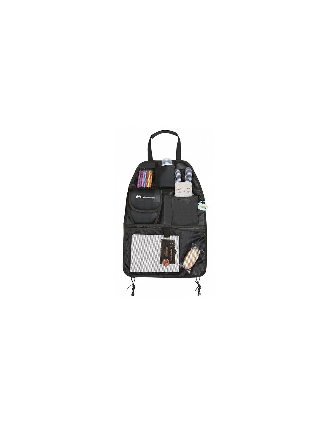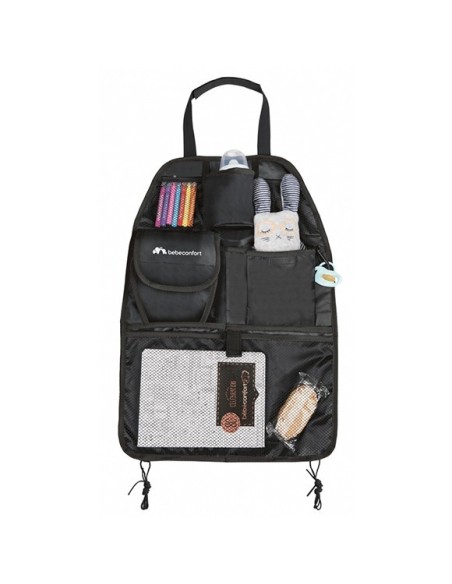 Organizer per sedile posteriore con diverse tasche per tenere in ordine oggetti e giochi e speciale tasca portabibite. Passante per succhietto.