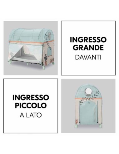 Il tuo bambino fa tutto da solo? Nel suo palazzo o nel suo giardino si arriva senza il tuo aiuto. La Travel Bed Cover ha un ampio ingresso frontale e un ingresso laterale più piccolo.