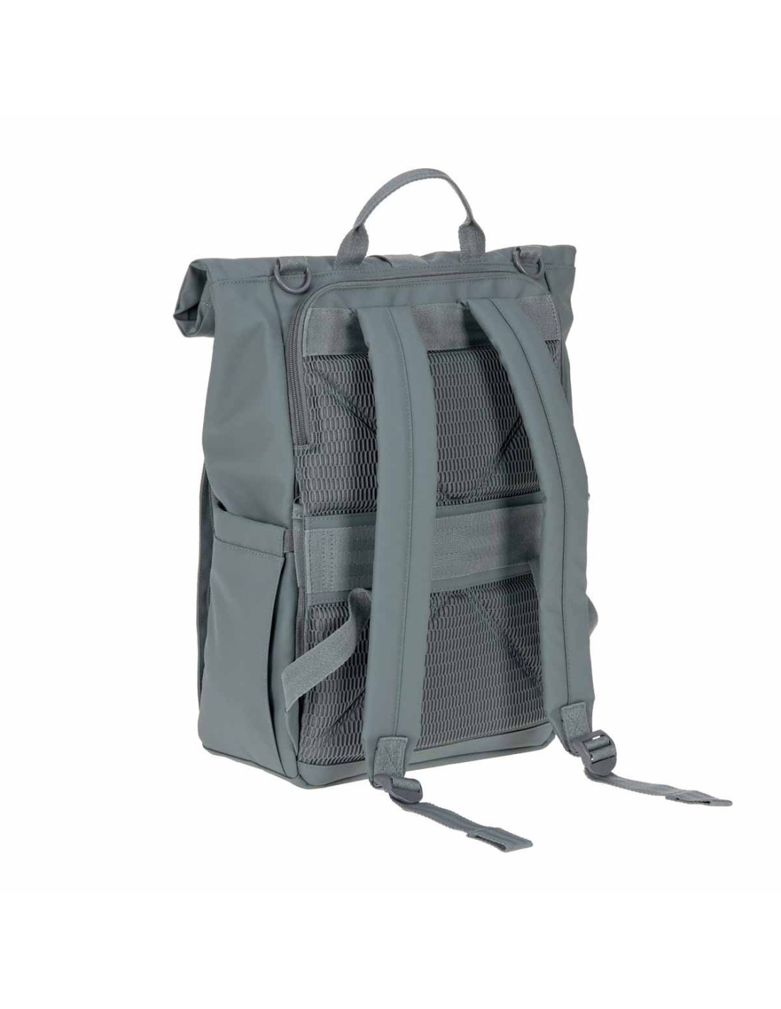Zaino Fasciatoio Rolltop Backpack di Lassig, realizzato in tessuto di poliestere riciclato al 100% con i suoi pratici accessori per il cambio del pannolino